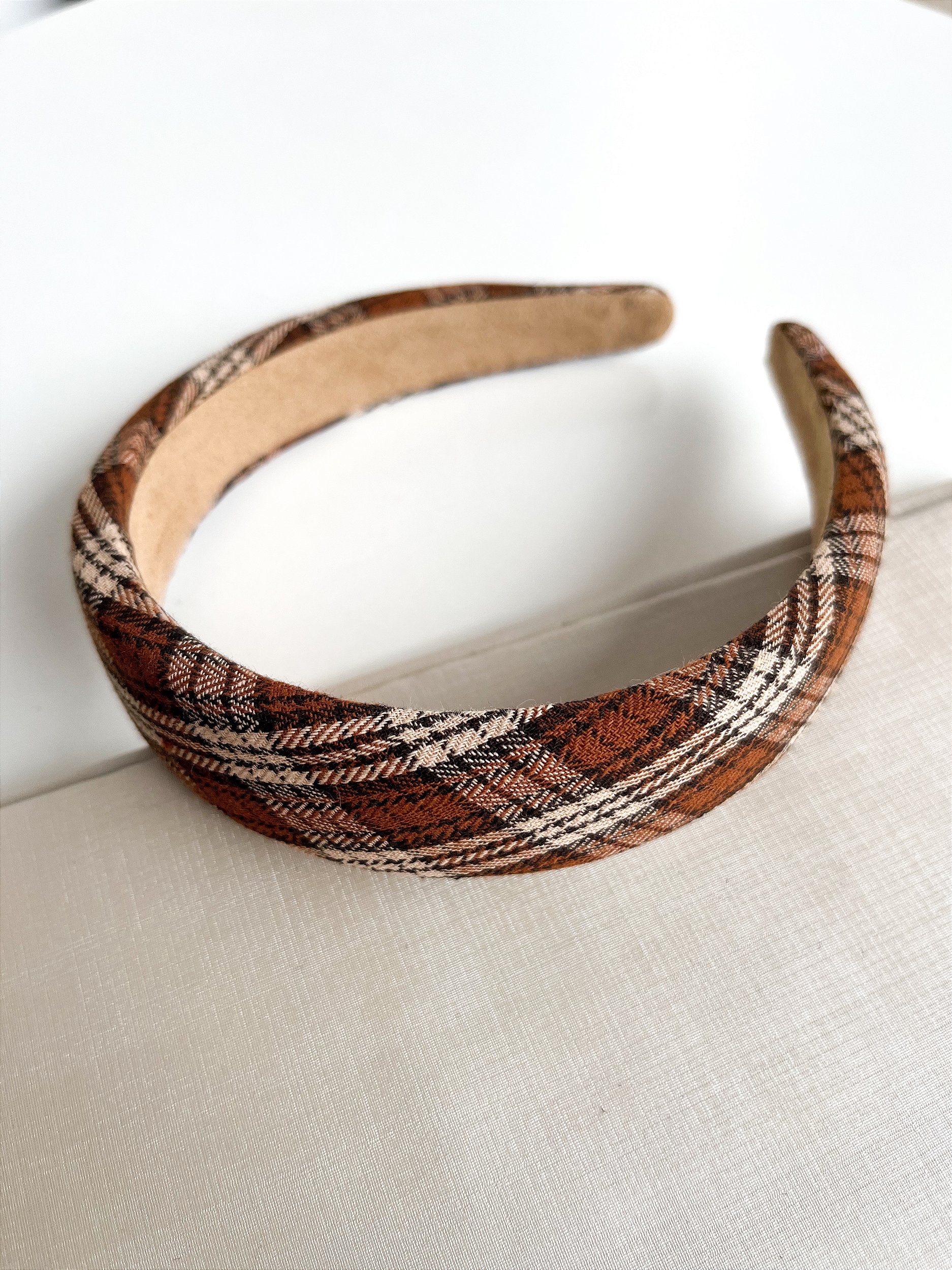 Tiara em Tecido Marrom Xadrez com Forro Interno em Suede